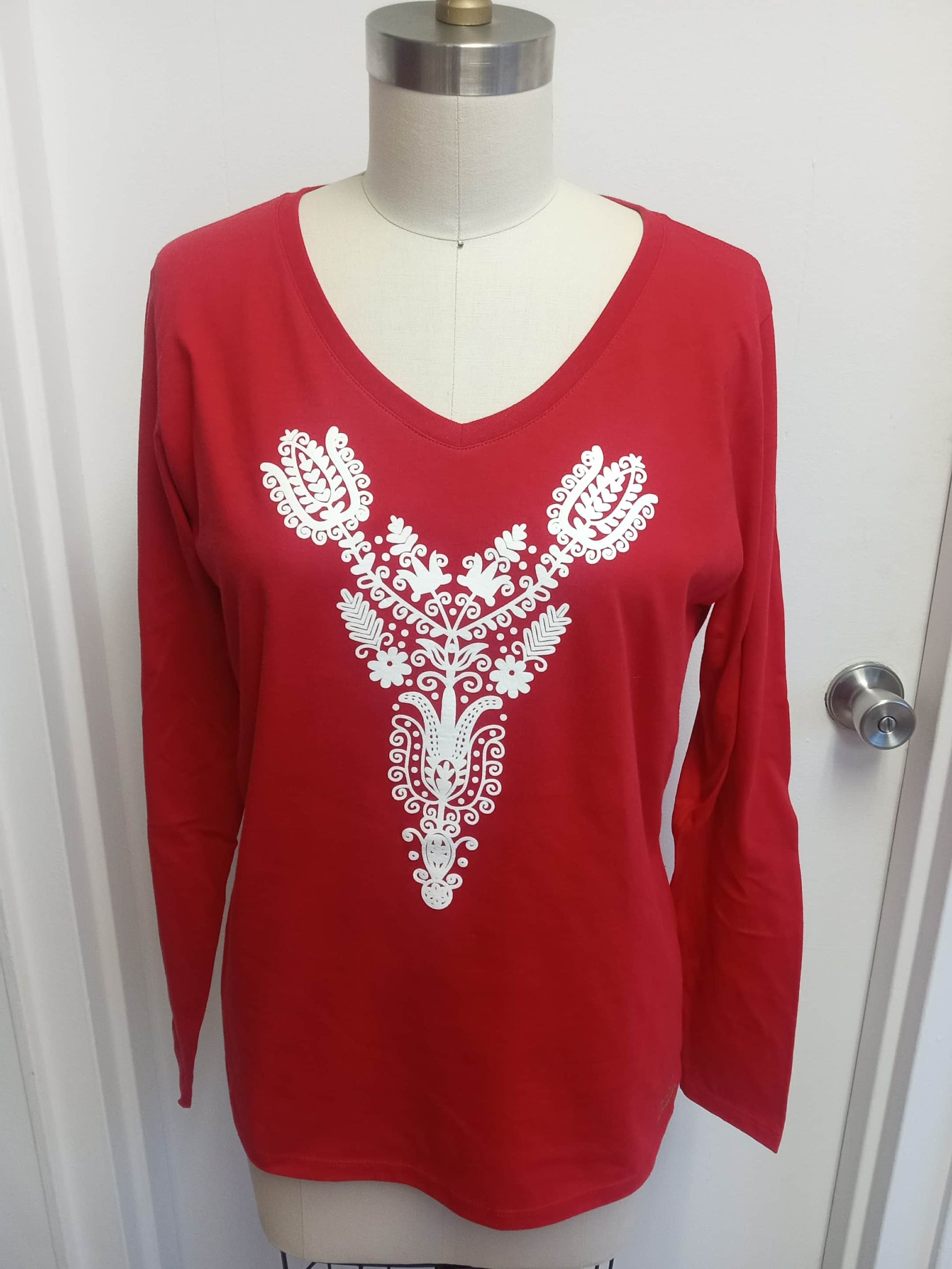 This black V-neck women’s LS shirt is more than just a wardrobe staple — it’s a tribute to Hungarian heritage. Adorned with a delicate Kalotaszeg motif, the design draws from the rich embroidery traditions of Transylvania, where bold florals and fine details speak the language of centuries-old craftsmanship.