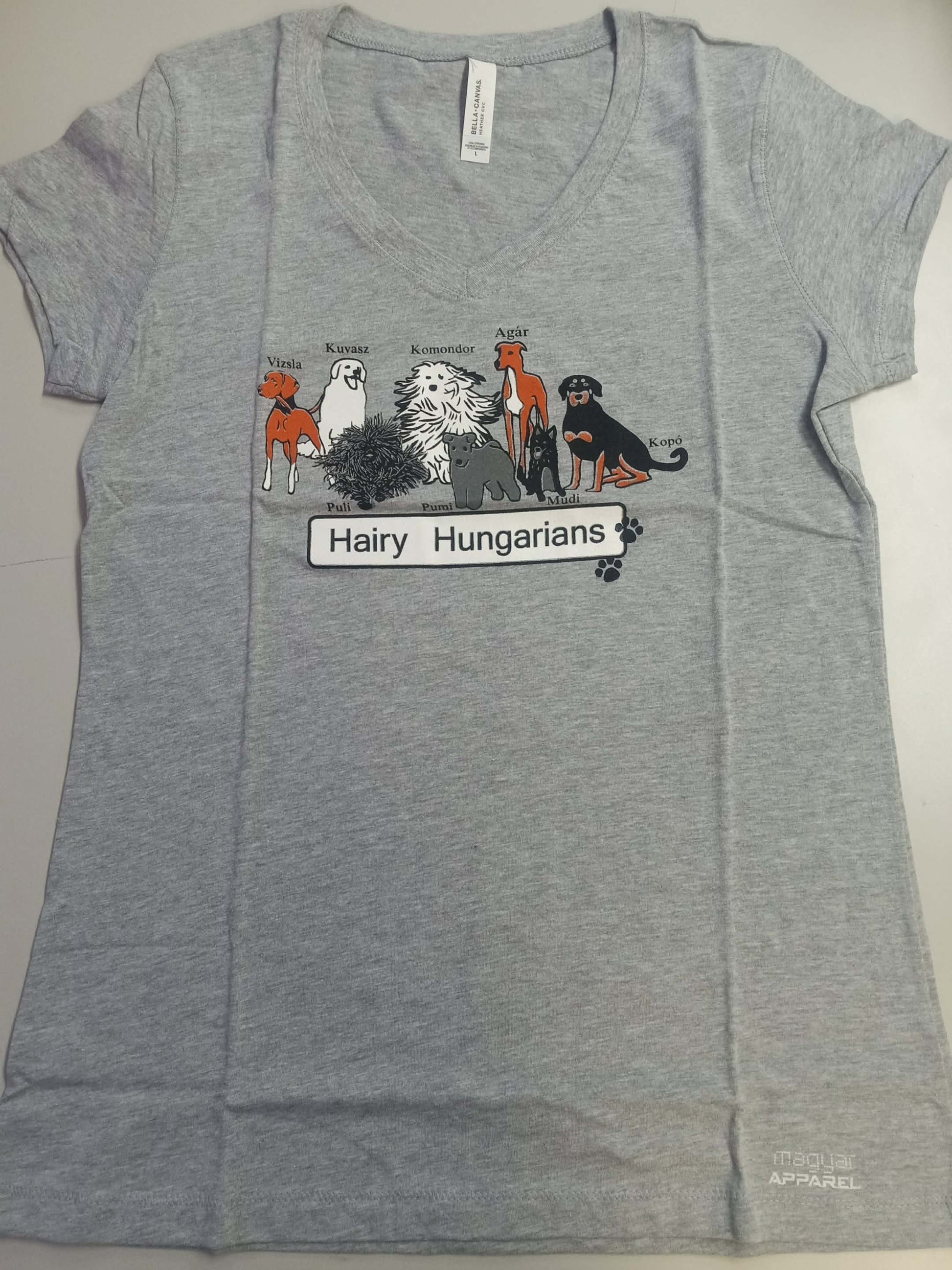 Celebrate Hungary’s iconic dog breeds with this playful, heritage-inspired design. Printed on a soft heather gray women’s V-neck, the artwork features beloved Hungarian breeds—Vizsla, Kuvasz, Komondor, Puli, Pumi, Mudi, Agár, and Kopó—finished with the “Hairy Hungarians” signature.