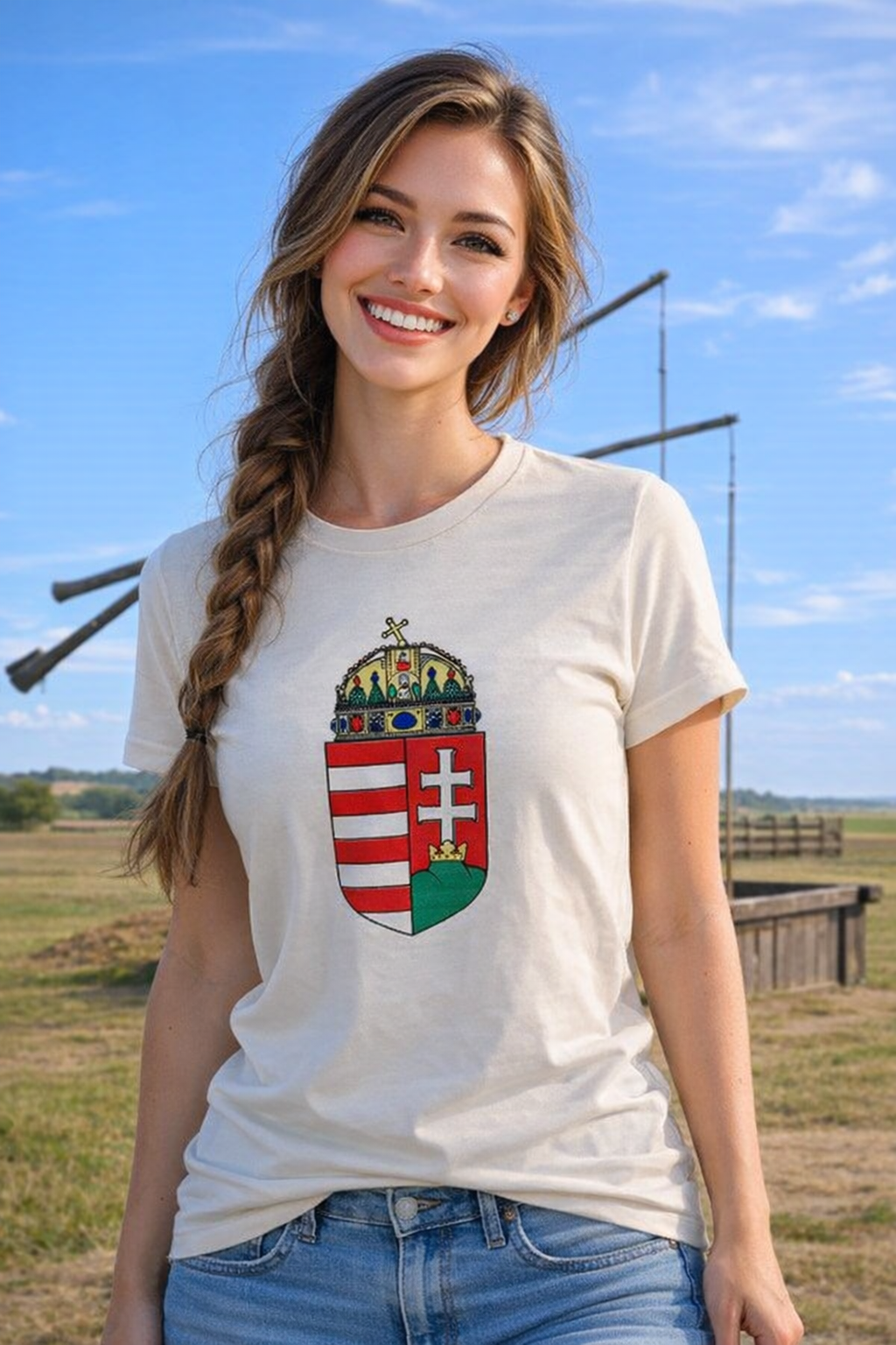 Celebrate your heritage in timeless style with this premium-quality tee featuring the Hungarian Coat of Arms. Printed in vibrant detail, the iconic crest stands out boldly against the shirt’s natural cotton-poly blend fabric, offering both comfort and durability.